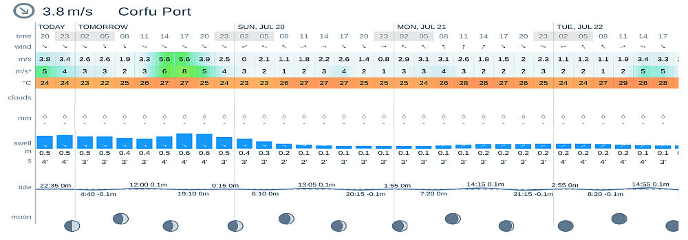 A useful chart showing temperature and rainfall, a description of the climate at different times of the year and a list of the Corfiot names of the winds - plus the current temperature.